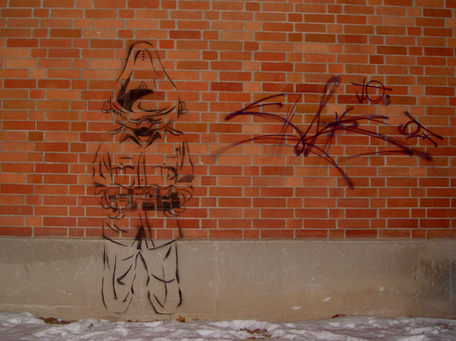 In response to a recent Citytv interview during which Jonsson fumblingly cites readymades as his inspiration (see also our interview with Jonsson), Posterchild stencilled Jonsson on his knees, with his head replaced by Duchamp’s Fountain, on the side of OCAD. “He is such a perfect stereotype of the sort of arrogant artist that gives the rest of us a bad name,” says Posterchild.